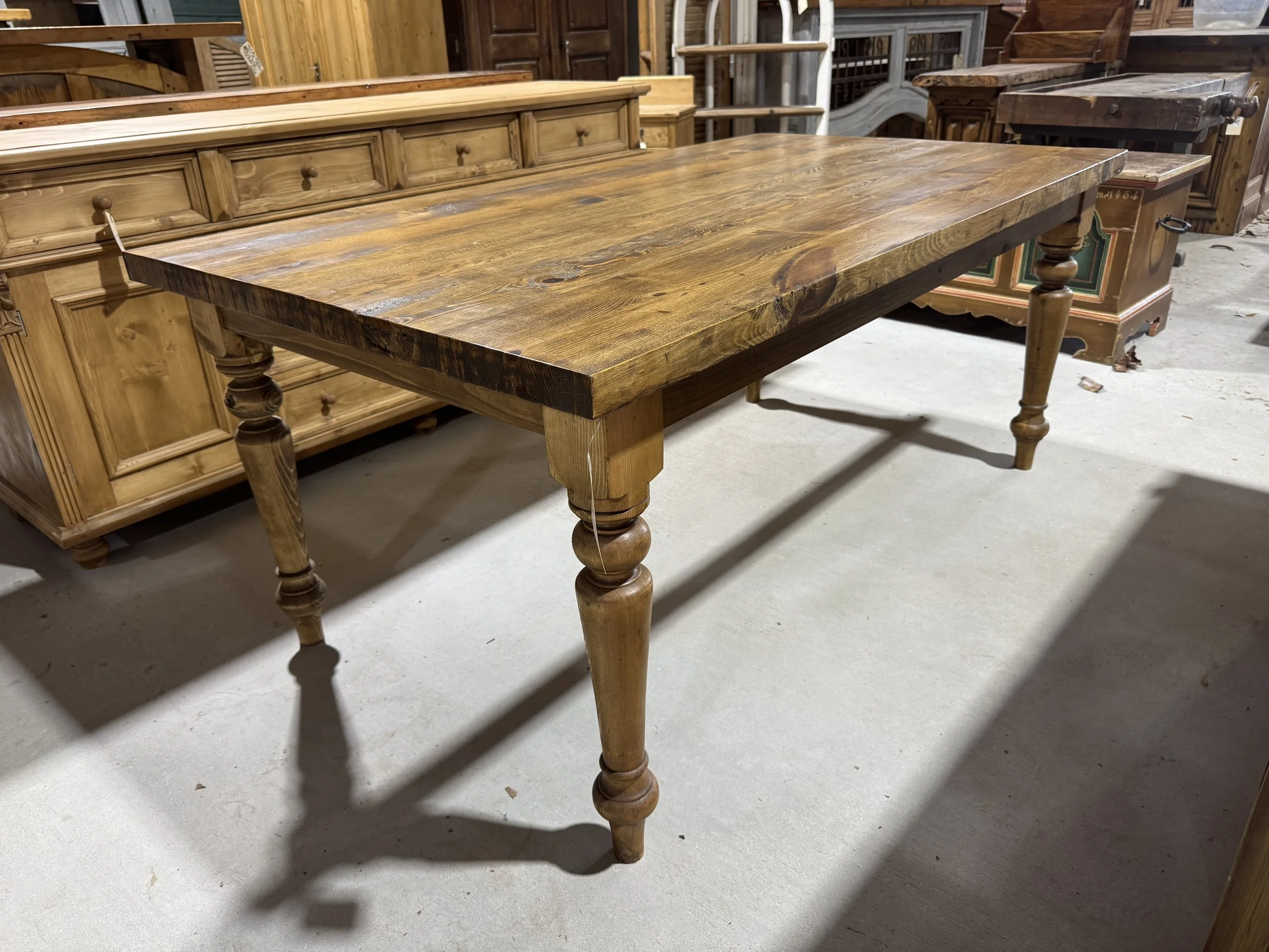 Custom tables. One of our most ordered custom built items. Again, another blog post will need to be dedicated to these! We have a large variety of styles, shapes and styles. Showing our standard farm table style in a pretty medium stain. Tops are usually our 1870’s split pine beam tops. However, we have a few different options for tops, too!